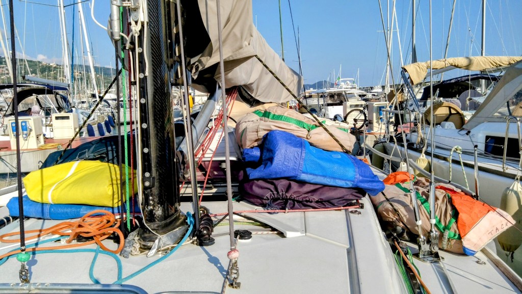 Sure thing! Our awesome host and co-owner Daria took care of all the provisions. We packed our personal stuff and stashed them in our assigned cabins. The sails, which were temporarily stored on the deck overnight, have now been moved below deck. We’ve completed the navigation preparations for our trip from Porto di Lavagna to Marines de Cogolin. We’ve checked everything for safety, untied the ropes, and boom… we’re off!