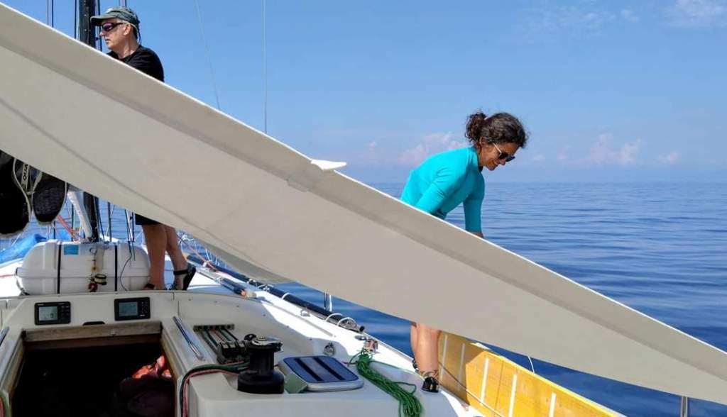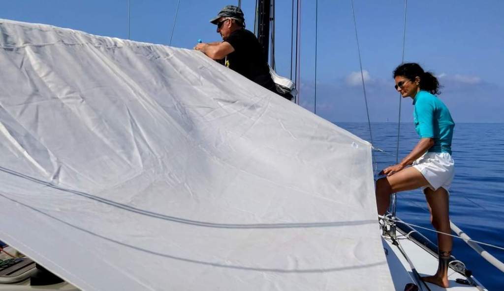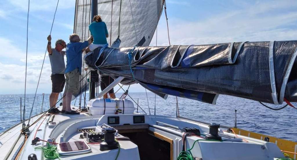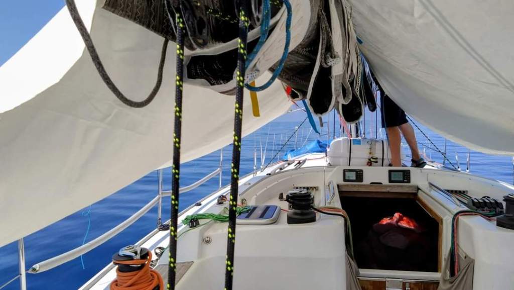 And then just like that, out of nowhere as predicted by the awesome PredictWind App, we finally caught some useful wind! We quickly unfurled the genoa, stashed away the boom tarp, and hoisted the mainsail after fixing a little issue. Life onboard instantly picked up its pace. No more leisurely sipping tea and chit-chatting. There was work to be done and a boat to be managed.