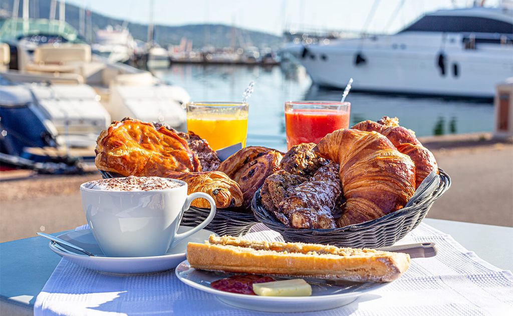 On our way to the boat, we made a pit stop at Le Comptoir des Marines, a cute little café-bakery by the marina. This is where we had breakfast every day: some espresso or regular coffee, freshly squeezed orange juice, bread, butter, jam or honey, and of course, a yummy croissant with a lovely view of the marina. It quickly became our favorite breakfast spot! 🥐🍊☕️